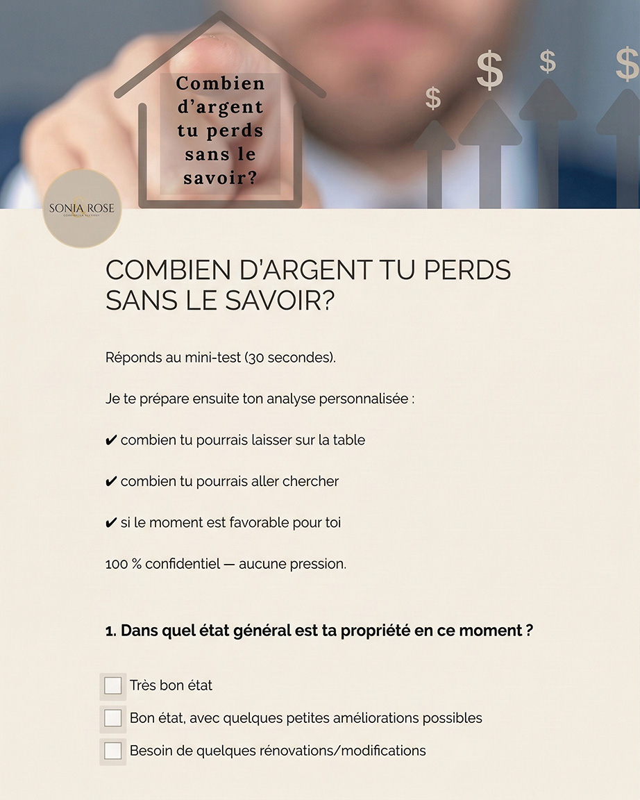 Réponds à ce mini-test et je t’envoie ton rapport personnalisé, basé sur ton secteur, ton type de propriété et la réalité actuelle du marché.